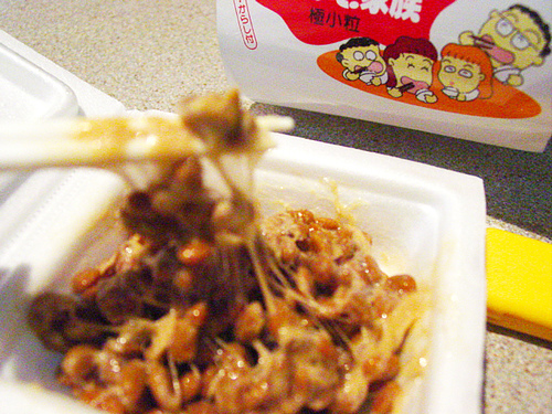 When I got home, I excitingly opened a pack to eat with my rice. It didn’t smell so bad. I think I’ve smelled far worse things. The pack had two packets in it. One is mustard (karashi) and the other is some shouyu-like broth. According to Iron Chef, the trick is stirring it round for 15 times. the thing is, I stirred it too fast and counted too slow that I overstirred my first natto. I placed some shouyu and and karashi after stirring and plopped it on top of my rice. The taste was… weird. At first it was okay. I kept on adding shouyu and it didn’t have any taste to begin with. It was sticky and gooey and weird in texture. In terms of texture, it was like eating with sticky phlegm in your mouth. It did partially have that cheesy flavor. If you don’t stir it well with the rice, you get to eat the natto itself. The natto itself tastes… fermented. I don’t know if you know what that tastes like, but yeah, it has that weird woody taste, as though it’s been grown in the ground. After that, I swore that natto may not be for me. But I have three packs to go… so I had to eat it. ><;;